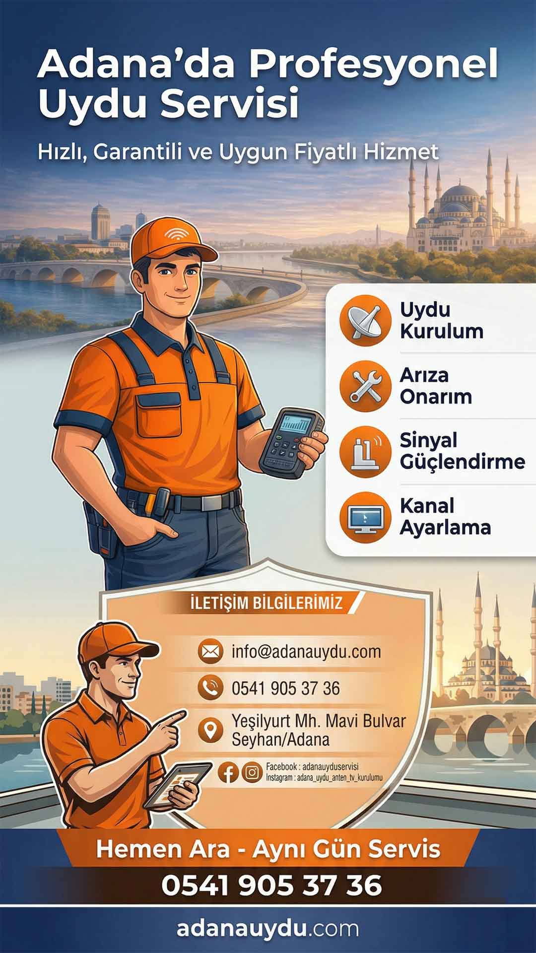 Adana Uyducu, uydu tamircisi, çanak anten kurulumu, uydu montajı, internet kablo çekme, modemden internet kablolama, wifi dağıtıcı, wifi çoklayıcı, wifi güçlendirici satışı ve kurulumu servisimiz sizlere Adana’nın; Mavi Bulvar, Beyazevler Mahallesi, Yeşilyurt Mahallesi, Yurt Mahallesi, Toros Mahallesi, Hayalpark, Tellidere Mahallesi, Pınar Mahallesi, Huzurevleri Mahallesi, Yüzüncüyıl Mahallesi, 2000 Evler Mahallesi, Belediye Evleri Mahallesi, Kenan Evren Bulvarı, Turgut Özal Bulvarı, Barış Manço Bulvarı, Alparslan Türkeş Bulvarı, 80. Yıl Bulvarı, Türkmenbaşı Bulvarı, Zahit Akdağ Bulvarı, Göl Mahallesi TOKİ Konutları, Damar Arıkoğlu Bulvarı, Uğur Mumcu Bulvarı, Seyhan ve Çukurova ilçelerinde; uydu, çanak anten satışı, montajı, kurulumu, uydu anteni arızası, merkezi uydu sistemi arızaları ve daire içi anten kurulumu, türksat uydu kanal güncelleme, frekans güncelleme, duvar askı aparatı satışı ve montajı, tv tamiri, tv led değişimi, tv ses var görüntü yok tamiri, tv açılmıyor arızasının tamiri ayrıca Wifi Dağıtıcı, Wifi Çoklayıcı, Wifi Güçlendirici Kurulumu ve İnternet Cat6 Kablolama Hizmeti gibi işleriniz için hizmet vermektedir.